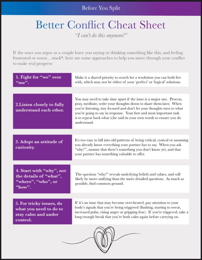 5. The enemy targets marriages to destroy it – I noticed especially before the children enter their teen years. Nurturing them into independent and successful young adulthood is going to take about ten years of intense roller coaster ride for parents. It will be much easier if you have a healthier marriage or peaceful unity with your ex. I’ve attached picture files that I think you will find useful in relationship conflicts. One is a cheat sheet created by Toni Nieuwhof (the Canadian pastor, Carey’s wife that I told you about last week). She also wrote a book called “Before You Split”. Here is the link to her book: