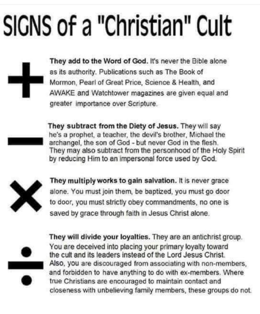Here is a good cheat-sheet that I saved while ago about recognizing Christian Cults. Please save this important reference.