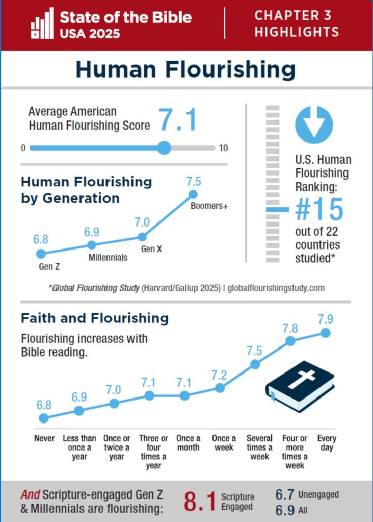 Here is more research that came out recently that shows that if you simply read the Bible daily then you will be more content, positive and flourish in life. Please share this research report with those who are resistant to reading their Bible every day.