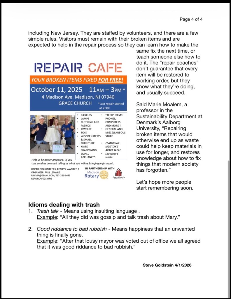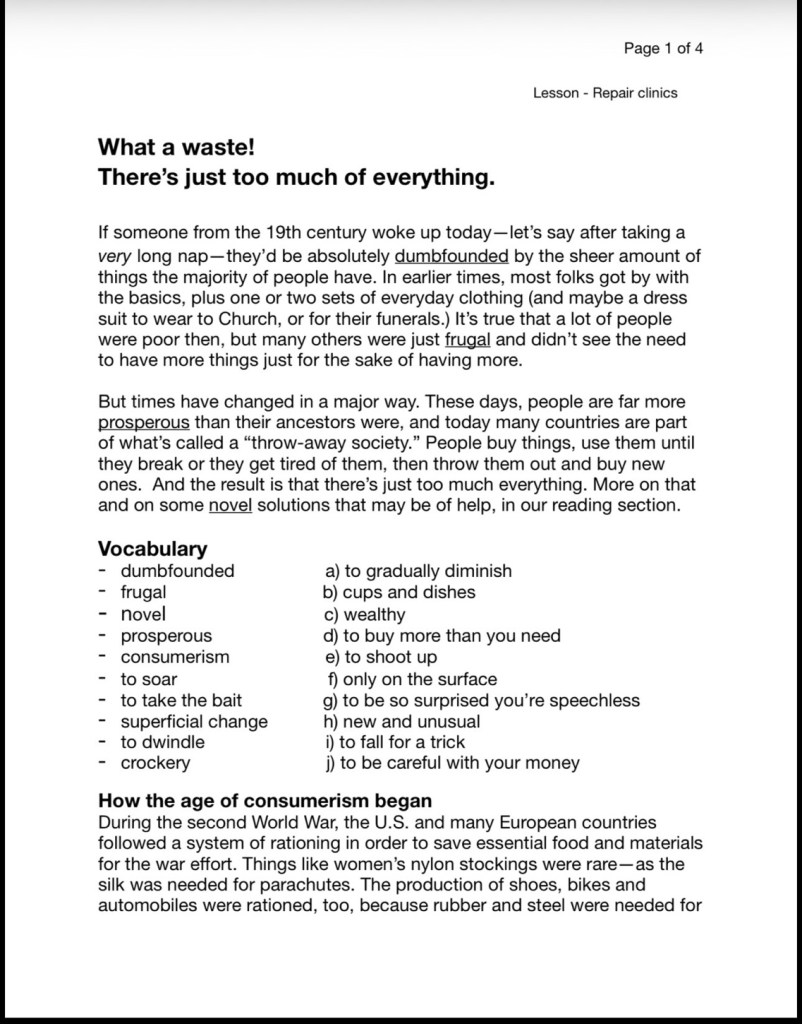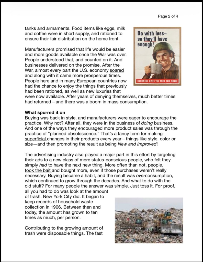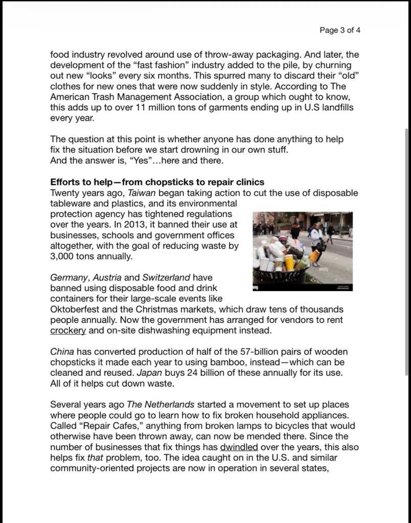 (I just read this short writing in an English tutoring workshop where I volunteer at. It is about the excessive garbage problem of today, and the creative solutions to repair, reuse and recycle. The article also talked about how it used to be during WWII and in the past. It’s so interesting. I remember only having about 4-5 shoes in high school (late 80s) but I never thought I was poor or lacked shoes. Today, I have way too many shoes. It’s embarrassing to note that I only wear about 6 pairs regularly. I’ve attached this short article at the bottom if anyone is interested in reading it.)